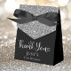 This fabulous modern 85th Birthday Silver Glitter Black Thank You favour box with sparkling silver glitter, Thank You in a trendy script font and the birthday girl's name in silver with an elegant black bow would be perfect for your event. It would be great for a candy station, on a thank you gift table, or at each place setting with a favour. Be sure you order enough for all your guests.