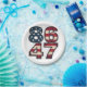patriotic graphic, American flag design, "86 47" font, representing Trump’s age and election victory, presidential inauguration day, conservative message, patriotic pride, vintage-style political statement, red, white, and blue theme.