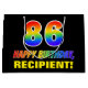 This fun, cheerful, and colourful birthday gift bag design features a large number "86" and the message "HAPPY BIRTHDAY,", both coloured with a rainbow spectrum gradient inspired pattern, along with a bold yellow customisable recipient name. The background is coloured black. A fun birthday themed gift bag like this might be used to wrap a gift or present being given to celebrate somebody’s eighty sixth birthday. [~Z0000477]