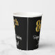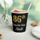 This luxurious, stylish, and elegant birthday themed paper cup design features a large ordinal number “86th” having a faux/imitation gold-like gradient pattern, plus the birthday greeting message “Happy 86th Birthday,” and a personalised name in a script-style font. The background is coloured black. Stylish birthday themed paper cups like this might be used at a party in celebration of somebody’s 86th birthday. [~Z0000538]
