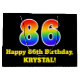This fun and vibrant birthday gift bag design features a large number "86" with a rainbow spectrum gradient inspired pattern, along with the message "Happy 86th Birthday,", and an editable name. The background is coloured black. A colourful birthday themed giftbag like this might be a fun way to wrap a gift or present being given to celebrate somebody’s 86th birthday. [~Z0000521]