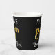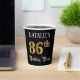 This ornate and luxurious birthday themed paper cup design features an editable name and the message “86th Birthday Party”. The large number “86th” has an imitation/faux gold-inspired colouring pattern, and the words “Birthday Party” are in fancy script-style text. The background is coloured black by default (although it can be customised). Opulent, fancy paper cups like this might be useful at a birthday celebration/party being held to celebrate somebody’s 86th birthday. [~Z0000567]