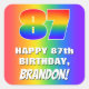 This vibrant and fun birthday themed square sticker design features a large number “87” with a colourful rainbow spectrum inspired gradient pattern, along with the message “HAPPY 87th BIRTHDAY,”, and an editable recipient name. The background also features an exciting multicolored rainbow spectrum inspired gradient pattern. Fun, joyful, personalised stickers like this might be given as a birthday present, or used while wrapping gifts/presents, or perhaps used as a birthday party decoration when celebrating somebody’s eighty seventh birthday. [~Z0000571]