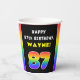 This joyful and upbeat birthday paper cup design features a large number “87“ having a multicolor rainbow spectrum inspired gradient pattern, along with the message “HAPPY 87th BIRTHDAY,”, and a custom recipient name. Paper cups like this might be used at a party for somebody who is celebrating their 87th birthday. [~Z0000639]