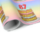This joyful and upbeat birthday wrapping paper design features a cartoon-style depiction of a three-tier birthday cake having numeral-shaped candles on top showing the number “87“, along with the message “HAPPY 87TH BIRTHDAY,”, and an editable recipient name. The background features a multi-colour pastel rainbow spectrum inspired gradient pattern. Birthday themed wrapping paper like this might be used when giving a gift or present in celebration of somebody’s 87th birthday. [~Z0000622]