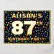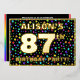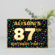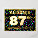 The front of this upbeat eighty-seventh birthday party/celebration foil invitation card design features a personalised name, a large number “87th”, the message “BIRTHDAY PARTY!”, and a border. The background of the front has a vibrant, multicolored star shapes pattern. The back features personalised details about the event, such as the date, time, location/venue, and any other useful information. Customised invitations like these might be a fun way to invite attendees to a birthday gathering/party being held to celebrate somebody’s 87th birthday. [~Z0000600]