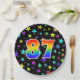 This fun, cheerful, and colourful paper plate design features a large number "87" having a rainbow spectrum gradient inspired pattern colouring. The background features a colourful pattern of star shapes. Paper plates like this might be used when celebrating somebody’s 87th birthday, or a couple’s 87th anniversary, or some other 87th event. [~Z0000493]