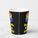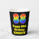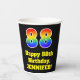 This fun and exciting birthday themed paper cup design features a large number “88” with a rainbow spectrum gradient inspired pattern, along with the message “Happy 88th Birthday,”, and a custom name. The background is coloured black. Colourful, vibrant paper cups like this might be fun to use at a birthday celebration being held to celebrate somebody’s 88th birthday. [~Z0000537]