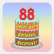 This fun and colourful birthday square sticker design features a cartoon-style depiction of a three-tier birthday cake having number-shaped candles on top showing the age “88“, along with the message “HAPPY 88TH BIRTHDAY,”, and a personalised recipient name. The background has a multicolored pastel rainbow spectrum inspired gradient pattern. Cheerful birthday themed stickers like these might be distributed or used at a party celebrating somebody’s eighty eighth birthday, or perhaps used when wrapping gifts/presents or preparing invitations for such an event. [~Z0000624]