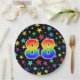 This fun, cheerful, and colourful paper plate design features a large number "88" having a rainbow spectrum gradient inspired pattern colouring. The background features a colourful star shapes pattern. Fun paper plates like this might be used at somebody’s eighty eighth birthday celebration, or a couple’s 88th anniversary party, or some other eighty eighth event. [~Z0000493]