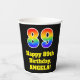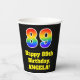 This fun and exciting birthday-themed paper cup design features a large number “89” with a rainbow spectrum gradient inspired pattern, along with the message “Happy 89th Birthday,”, and an editable name. The background is coloured black. Vibrant, colourful paper cups like this might be fun to use at a birthday party being held to honour somebody’s 89th birthday. [~Z0000537]
