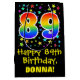 This fun, colourful, and vibrant birthday-themed gift bag design features a large number "89" with a rainbow spectrum gradient style pattern, along with the message "Happy 89th Birthday,", and a personalised recipient name. It also has a colourful background pattern featuring star shapes of various sizes. A fun gift bag like this might be used when wrapping presents being given to somebody in celebration of their eighty ninth birthday. [~Z0000510]
