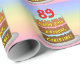 this colourful and cheerful birthday wrapping paper design features a cartoon-style depiction of a three-tier birthday cake having numeral-shaped candles on top showing the number “89“, along with the message “HAPPY 89TH BIRTHDAY,”, and a custom recipient name. The background features a multi-colour pastel rainbow spectrum inspired gradient pattern. Wrapping paper like this might be a fun way of wrapping a birthday present or gift being given to somebody who is celebrating their eighty ninth birthday. [~Z0000622]