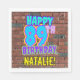 This fun birthday themed paper napkin design features the message “HAPPY 89TH BIRTHDAY,” having a vibrant, colourful, graffiti and urban street art inspired appearance, plus a custom recipient name. The background features a brick wall inspired pattern. Paper napkins like this might be used at a birthday party for somebody who is celebrating their eighty ninth birthday. [~Z0000534]