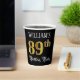 This elegant and luxurious birthday paper cup design features a custom name and the message “89th Birthday Party”. The large number “89th” has an imitation/faux gold-inspired colouring pattern, the words “Birthday Party” are in fancy script-style text, and the background is coloured black by default (although it can be customised). Opulent, fancy paper cups like this might be useful at a birthday celebration/party being held in celebration of somebody’s eighty ninth birthday. [~Z0000567]