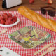 Paper plates for parties, celebrations with wine, cheese, olives, olive oil, dried flowers against an antique Persian rug. Fabulous for cocktail parties, appetizers, gift-giving to a hostess.