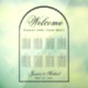 A simple transparent wedding seating chart inside a modern arch frame. The text and the frame are black. The Welcome and the names are written in an elegant calligraphy.