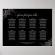 This beautiful wedding seating chart features a chic sophisticated design with gray text on a black background. The title is an elegant script calligraphy reading: please find your table. The corners are decorated with silver faux foil frills in a delicate floral pattern. Includes seating for 8 tables or 80 guests with 10 seats per table. Wonderful way to help your guests find their tables at your reception while adding a touch of style.