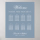 A simple seating chart with 8 tables, for a wedding with dusty blue wedding colour. The background is dusty blue, the text is white. The word Welcome in the upper part and the names of the bride and groom are written in an elegant calligraphic script, the rest in caps.