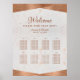This wedding seating chart with 8 tables combines multiple trends of 2019: geometric, marble, metallic(copper) and special fonts (an elegant calligraphic script). The background is white marble. On the borders up and down, there is faux metallic copper, forming angles and an irregular hexagon of white marble. The names of the bride and groom and the title Welcome are written in an elegant calligraphic script . All text has a red-brown color, like the copper.