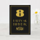 The front of this vintage look and 1920s-1930s style inspired birthday greeting card design features a large art deco style inspired number "8", the message "HAPPY 8th BIRTHDAY,", a personalised name, and a border pattern consisting of lines. There is a black-coloured background on the front. The inside features an editable birthday greeting message, or could perhaps be cleared and left blank if a message is to be written by hand instead. A personalised birthday card like this might be a fun way to send birthday wishes to somebody who is celebrating their eighth birthday. [~Z0000502]