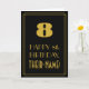This Roaring '20s era inspired and vintage/retro look birthday greeting card design features a large art deco look inspired number "8", the message "HAPPY 8th BIRTHDAY,", a customisable name, and a border pattern consisting of thin lines on the front. The front has a black-coloured background. The inside has a custom birthday greeting message, or could perhaps be cleared and left blank if a message is to be written by hand instead. A personalised birthday greeting card like this might be sent in celebration of somebody’s eighth birthday. [~Z0000499]