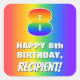 This vibrant and joyful birthday square sticker design features a large number “8” with a colourful rainbow spectrum inspired gradient pattern, along with the message “HAPPY 8th BIRTHDAY,”, and a custom recipient name. The background also features a cheerful multicolored rainbow spectrum inspired gradient pattern. Exciting, fun, personalised stickers like this might be given as a birthday gift, or used while wrapping presents/gifts, or perhaps used as birthday party decorations when celebrating somebody’s eighth birthday. [~Z0000571]