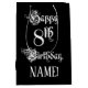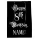 This lavish and fancy birthday-themed gift bag design features the message “Happy 8th Birthday,” in opulent script style text, on a black coloured background. It also has a customisable recipient name. A birthday themed giftbag like this might be a respectable way to wrap a gift or present being given to celebrate somebody’s eighth birthday. [~Z0000557]