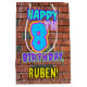 The front of this fun birthday-themed gift bag design features the message “HAPPY 8TH BIRTHDAY,” having a vibrant, colourful, urban street art and graffiti inspired appearance, in addition to a customisable recipient name. The background features a brick wall inspired pattern. A birthday themed giftbag like this might be a fun way to wrap a gift or present being given to celebrate somebody’s eighth birthday. [~Z0000536]