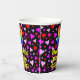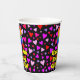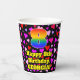 This fun and joyful birthday themed paper cup design features a large number “8” with a rainbow spectrum gradient inspired pattern, along with the message “Happy 8th Birthday,”, and a personalized name. The background features a pattern of heart shapes with colors like pink, purple, and red. Fun, happy paper cups like this might be fun to use at a birthday party being held to celebrate somebody’s eighth birthday. [~Z0000548]
