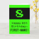 The front of this fun and nerdy birthday-themed greeting card design features a large green classic video game style number "8". It also features the birthday greeting message "Happy 8th Birthday,", and a personalised name. The inside features a personalised birthday greeting message, or could perhaps be cleared and left blank if a message is to be written by hand instead. A geeky birthday card like this might be a fun way to send birthday wishes to somebody who is celebrating their eighth birthday. [~Z0000430]