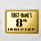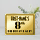 The front of this luxurious and 1920s-1930s era style inspired eighth birthday party foil invitation card design features a custom name, an art deco look inspired number “8th”, the message “BIRTHDAY PARTY”, and a border pattern consisting of lines. The back features personalised details about the event, such as the date, time, location/venue, and any other information that may be relevant. Stylish, elegant, personalised invitations like these might be used to invite attendees to a birthday party/gathering being held in celebration of somebody’s 8th birthday. [~Z0000606]