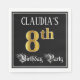 This ornate and opulent birthday themed paper napkin design features a personalised name and the message “8th Birthday Party”. The large number “8th” has a faux/imitation gold-inspired colouring pattern, the words “Birthday Party” are in luxurious script-style text, and the background is coloured black by default (although it can be customised). Luxurious, elegant paper napkins like this might be used at a birthday party/celebration being held to honour somebody’s eighth birthday. [~Z0000565]