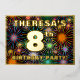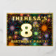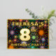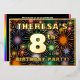 The front of this joyful and bold eighth birthday celebration/party foil invitation card design features an editable name, a large number “8th”, the message “BIRTHDAY PARTY!”, and a border. The background of the front features a vibrant, colourful bursting celebratory fireworks-inspired pattern. The back features personalised details about the event, such as the date, time, place, and any other important information. Editable invitations like these might be a fun way to invite guests to a birthday party/gathering being held in celebration of somebody’s 8th birthday. [~Z0000602]