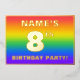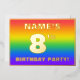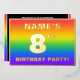 The front of this eye-catching eighth birthday party foil invitation card design features a customisable name, a large number “8th”, the message “BIRTHDAY PARTY!”, and a border. The background of the front features a vibrant, colourful, rainbow spectrum inspired gradient pattern. The back features personalised details about the event, such as the date, time, venue/place, and any other useful information. Customisable invitations like these might be a fun way to invite attendees to a birthday gathering/party being held in celebration of somebody’s 8th birthday. [~Z0000599]