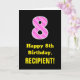 This fun and joyful birthday-themed greeting card design features a large number "8" with a dark pink and light pink stripes pattern containing heart shapes on the front. The front also features the birthday greeting message "Happy 8th Birthday,", and an editable recipient name. The inside features a custom birthday greeting message, or could perhaps be cleared and left blank if a message is to be written by hand instead. A personalised birthday card like this might be a fun way to send a message in celebration of somebody’s eighth birthday. [~Z0000434]