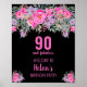 Elegant design for a 90th birthday party with a pink "90 and fabulous" and a scripted name embellished by a feminine watercolor flowers on a white background. Customise age, text, name and background colour.