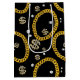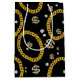 A hip hop 90's music style gold Cuban link chain theme design perfect for birthday parties, home decor, personalized gifts with a hip hop rap theme. Hand drawn Cuban link chain and accessories on a black background. Ideal for 90's theme hip hop and rap enthusiasts, black and gold designs and anyone who loves old school illustrations.