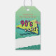 90's Party invitation featuring a fun style typography of '90's Party''. Design includes elements of blues, oranges, and pinks, yellow, ripped edges, geometric patterns and shapes inspired by the 90's. Place them on party favours to give your guests. Customise with a message. Extra space on bottom to hand write names or message.