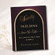 A Save the Date card for a 90th birthday party. A black and burgundy background, decorated with a faux gold arch. Personalise and add a date and your name. The text: Ninety and Save the Date is written with a large trendy hand lettered style script.
