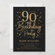 90th birthday party invitation in black and gold. Trendy modern design, perfect for a stylish men's or women's bday celebration. Features script font and confetti. Customize with your own details. Printed Zazzle invitations or instant download digital printable template.