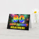 The front of this colourful, cheerful, and fun birthday-themed greeting card design features a large number "90" and the message "HAPPY BIRTHDAY,", both coloured with a rainbow spectrum gradient inspired pattern, along with a bold yellow custom recipient name. The front also has a multicolored bursting celebratory fireworks inspired background pattern. The inside features a customisable birthday greeting message, or could perhaps be cleared and left blank if a message is to be written by hand instead. A vibrant customisable birthday card like this might be a fun way to send a message celebrating somebody’s ninetieth birthday. [~Z0000471]