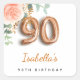 For an elegant and feminine 90th birthday party. A chic white background. Decorated with a rose gold and blush pink watercolored rose flower, floral, green eucalyptus leaves, sprigs, greenery and faux gold sprigs. Personalise and a name. Black and golden letters. The name is written with a modern hand lettered style script. Number 90 is written with a golden balloon style font.