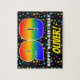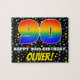 This eye-catching and colourful birthday themed jigsaw puzzle design features a large number “90” with a multicolored rainbow spectrum inspired gradient pattern, along with the message “HAPPY 90th BIRTHDAY,”, and a personalised recipient name. The background has an exciting, colourful stars pattern. A fun, personalised birthday puzzle like this might be used to celebrate somebody’s ninetieth birthday. [~Z0000607]