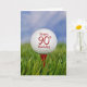 Close up of a white golf ball on a red tee in grass with sky background for 90th birthday.