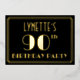 The front of this vintage-style ninetieth birthday celebration/party foil invitation features an editable name, a large art deco style inspired number “90th”, the message “BIRTHDAY PARTY”, and a border pattern consisting of lines. The background of the front is coloured black by default, but it can be customised to a different colour if desired. The back features personalised details about the event, such as the date, time, venue, and any other important information. Elegant, luxurious, customisable invitations like these might be used to invite guests to a birthday party/gathering being held to honour somebody’s 90th birthday. [~Z0000591]