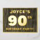 The front of this bold ninetieth birthday celebration/party foil invitation card features a custom name, a large number “90th”, the message “BIRTHDAY PARTY!”, and a border, all in foil. There is a rustic, yet elegant, faux wood grain appearance inspired pattern for the background of the front. The back features personalised details about the event, such as the date, time, location/venue, and any other relevant information. Customisable invitations like these might be used to invite attendees/guests to a birthday gathering being held to honour somebody’s 90th birthday. [~Z0000598]