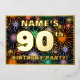 The front of this bold ninetieth birthday party/celebration foil invitation card design features a customisable name, a large number “90th”, the message “BIRTHDAY PARTY!”, and a border. The background of the front has an upbeat, colourful bursting celebratory fireworks-inspired pattern. The back features personalised details about the event, such as the date, time, venue/place, and any other relevant information. Customisable invitations like these might be a fun way to invite attendees/guests to a birthday gathering/party being held to honour somebody’s 90th birthday. [~Z0000602]