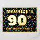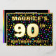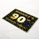The front of this exciting and joyful ninetieth birthday celebration/party foil invitation card design features a custom name, a large number “90th”, the message “BIRTHDAY PARTY!”, and a border. The background of the front has an upbeat, colourful star shapes pattern. The back features personalised details about the event, such as the date, time, venue, and any other information that may be useful. Customised invitations like these might be a fun way to invite guests/attendees to a birthday gathering being held to celebrate somebody’s 90th birthday. [~Z0000600]