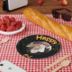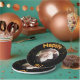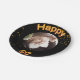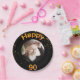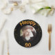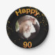 A paper plate for a 90th birthday party for guys. Template for your photo. Black background and the text: Happy 90. The text is written with a trendy faux gold balloon script. Golden confetti as decoration.